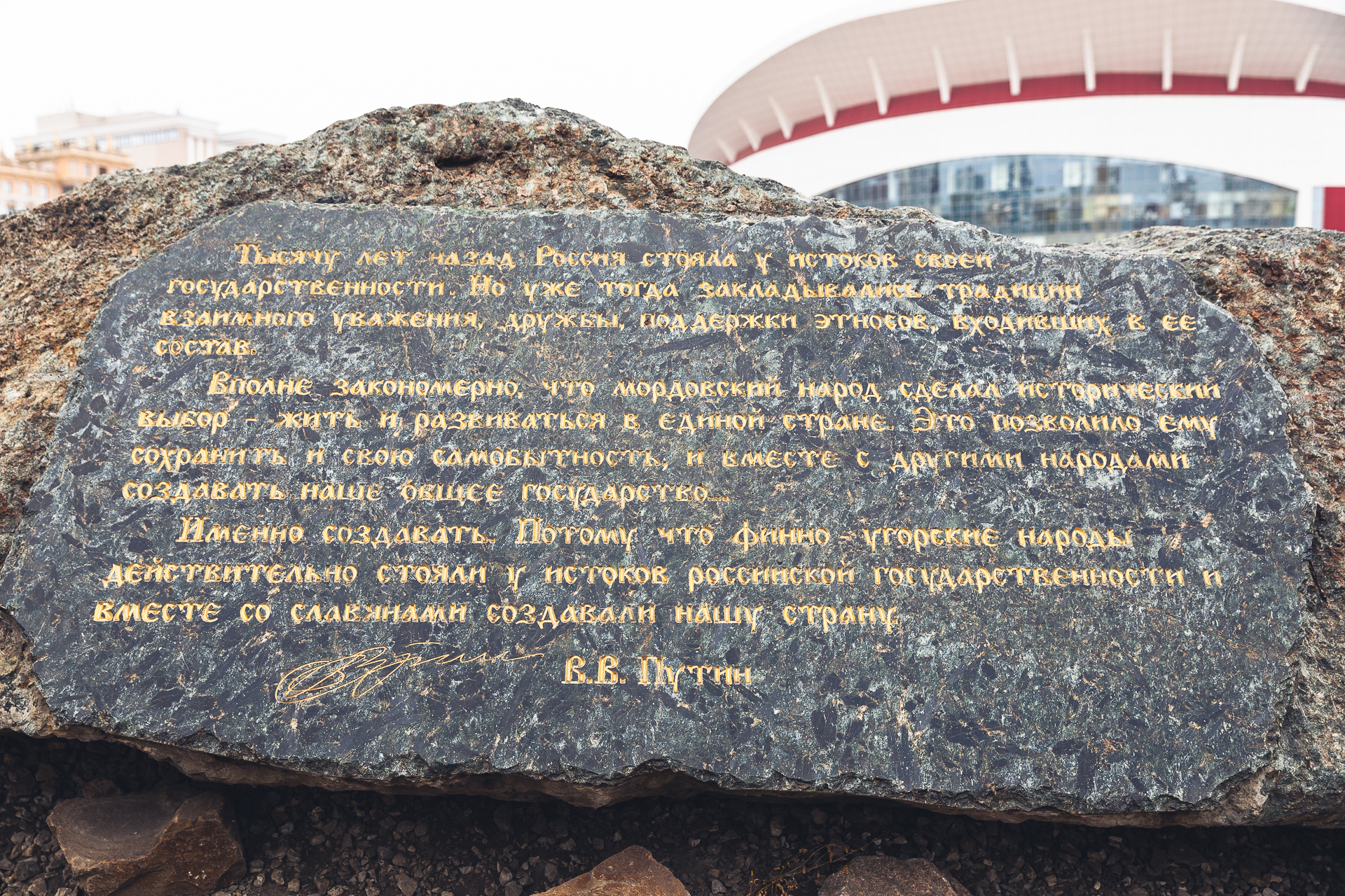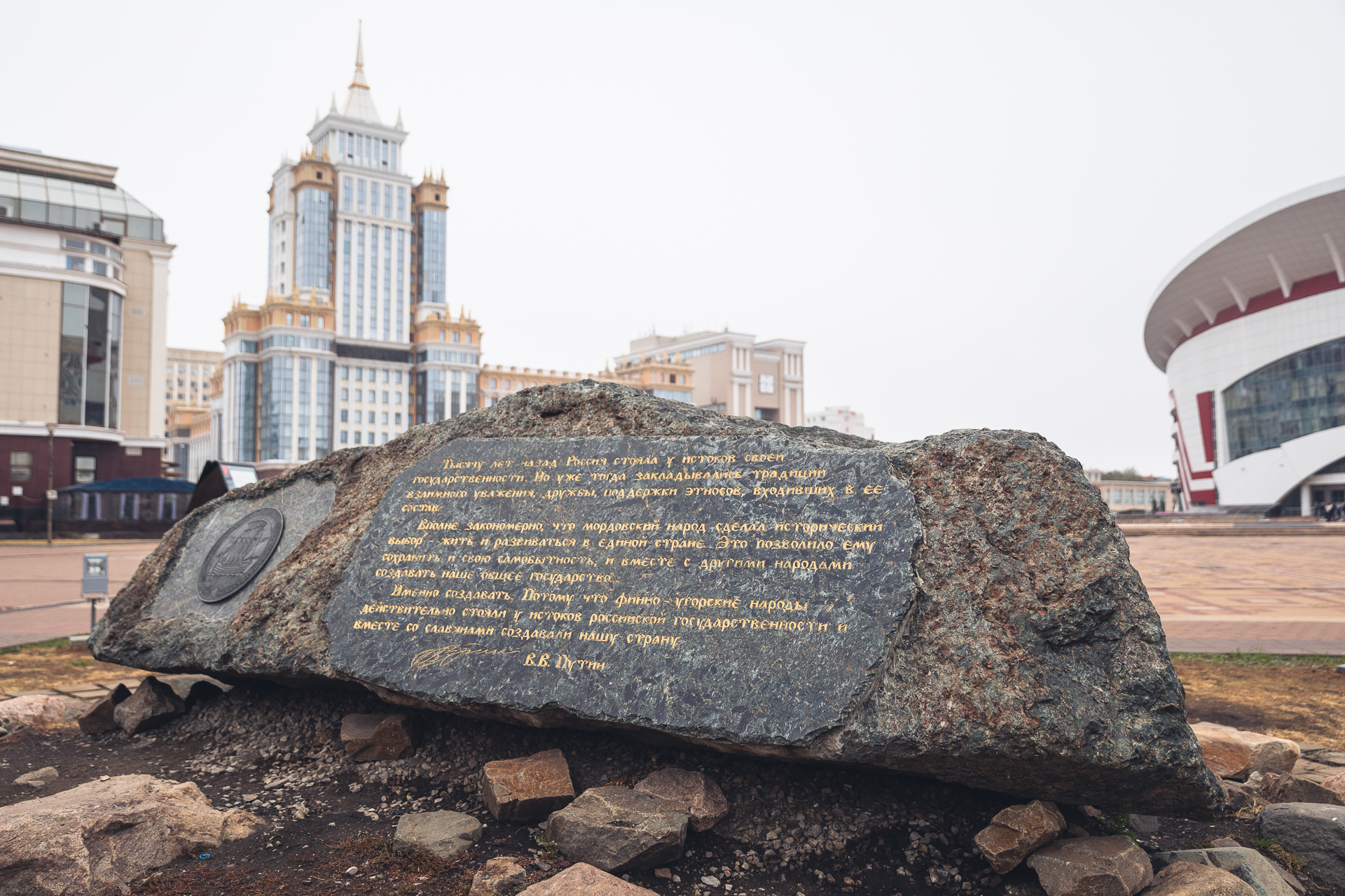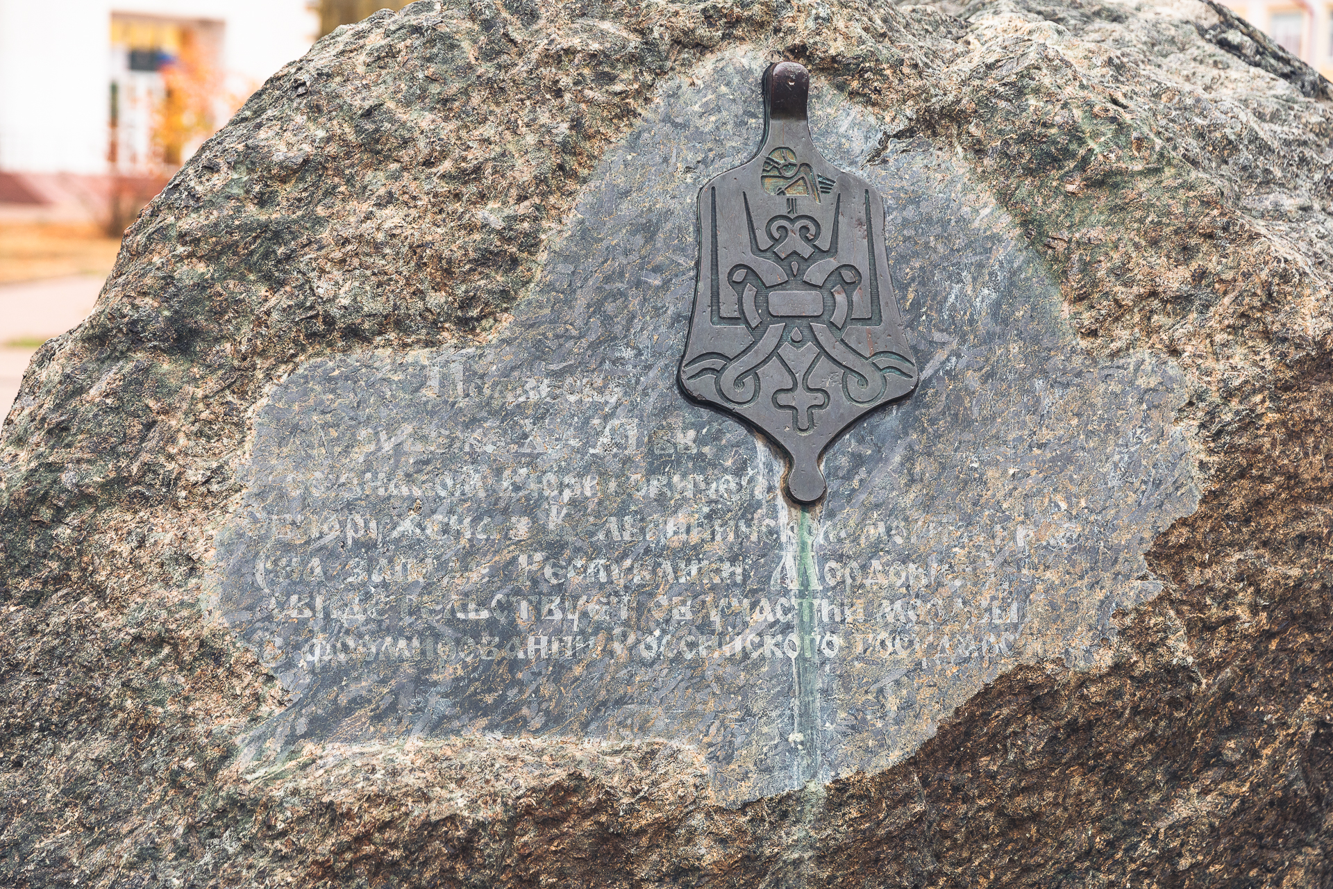 Камень – памятный знак Тысячелетия, на котором высечена древняя карта Мордовии. Это 34-тонный исторический памятник, на одной из сторон которого также изображена Подвеска рубежа X-XI в.в. со знаком Рюриковичей. Она обнаружена в Кельгининском могильнике (на западе Республики Мордовия) и свидетельствует об участии мордвы в формировании Российского государства. С другой стороны – послание В.Путина и круглый знак Тысячелетия.