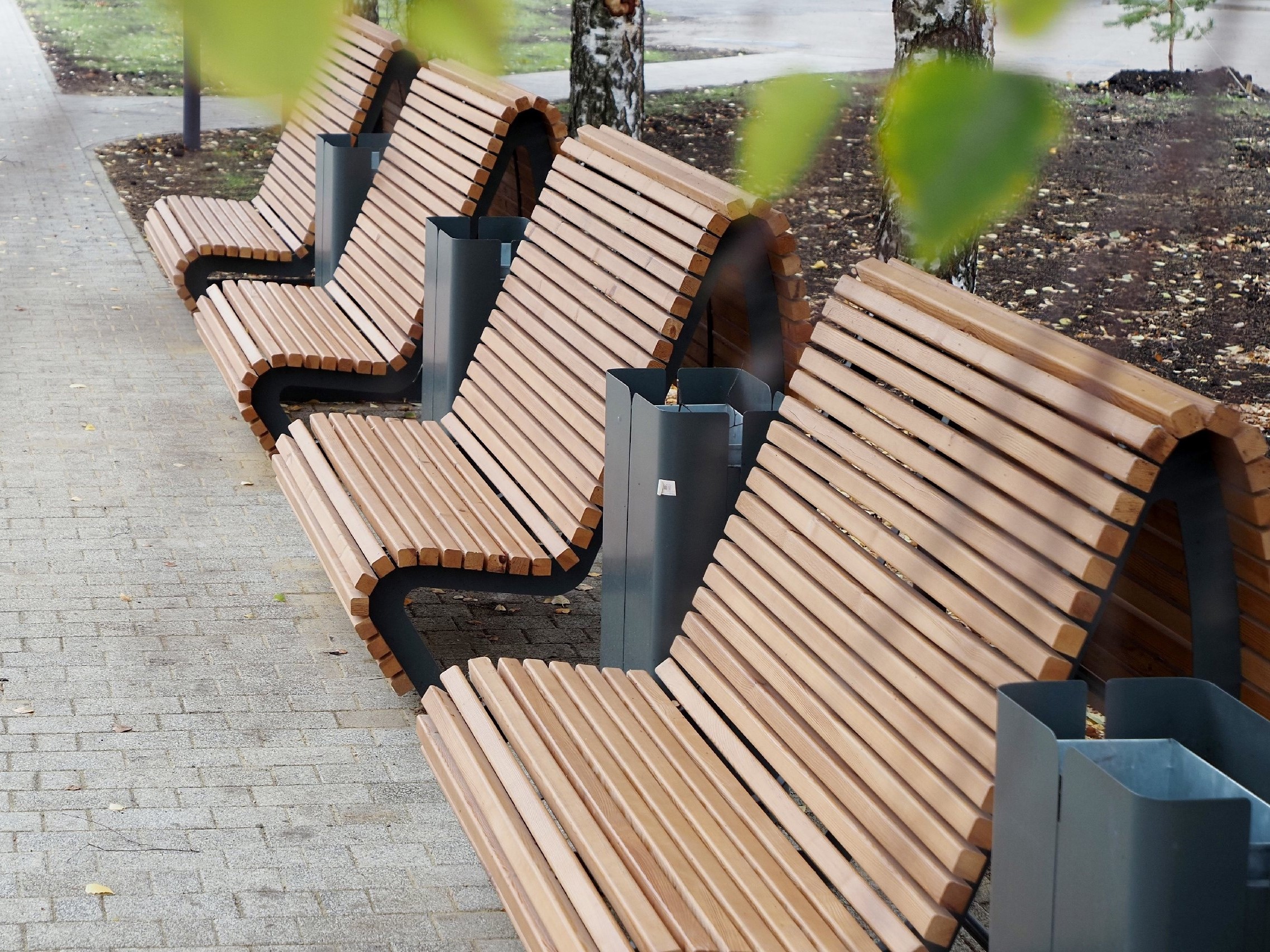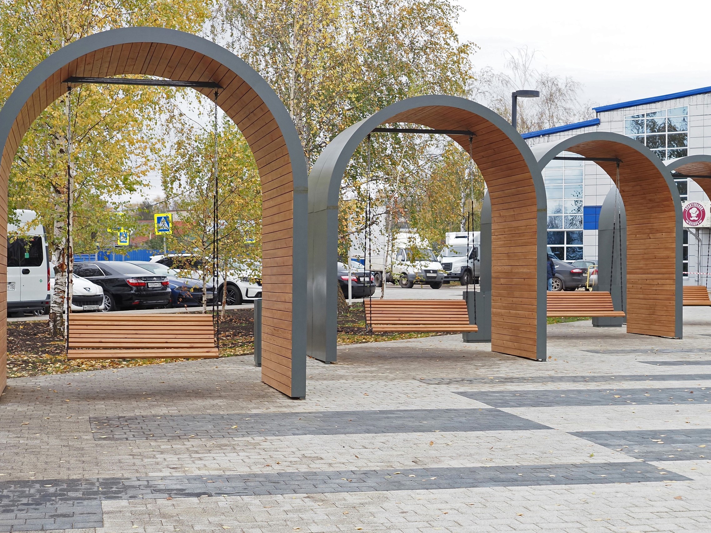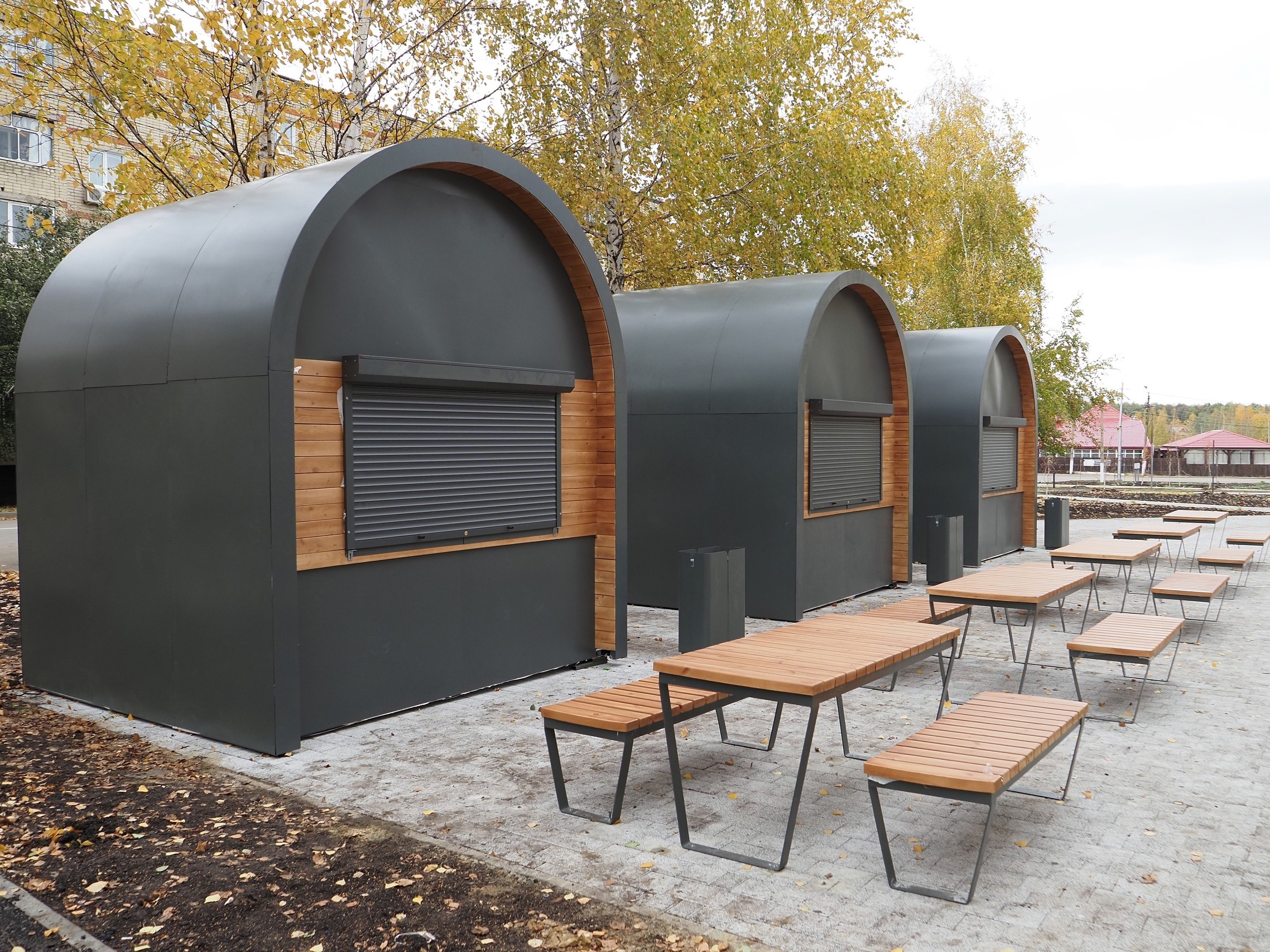 Скамеек большое количество, места хватит всем. Здесь возле торговых павильонов удобно расположились столики. Скоро начнется торговля, можно будет согреться горячими напитками. Аллею замыкают беседки, где молодежь прячется от ветра.