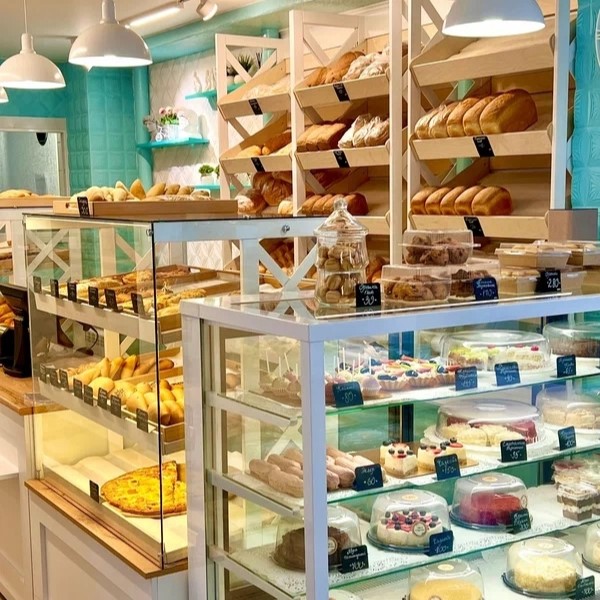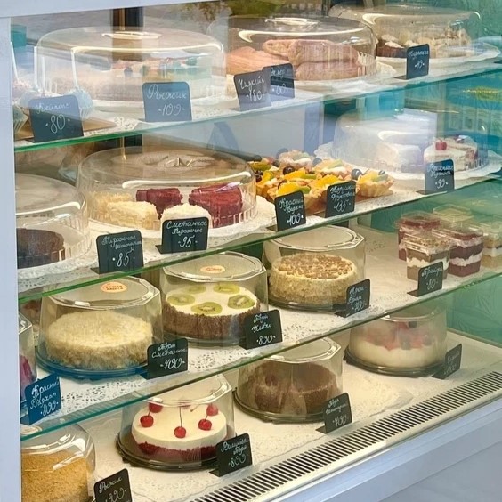 В ассортименте — широкий выбор тортов, пирожных, пирогов и других десертов, а также пицца и пирожки. Кроме того, кондитерская предлагает постные блюда.