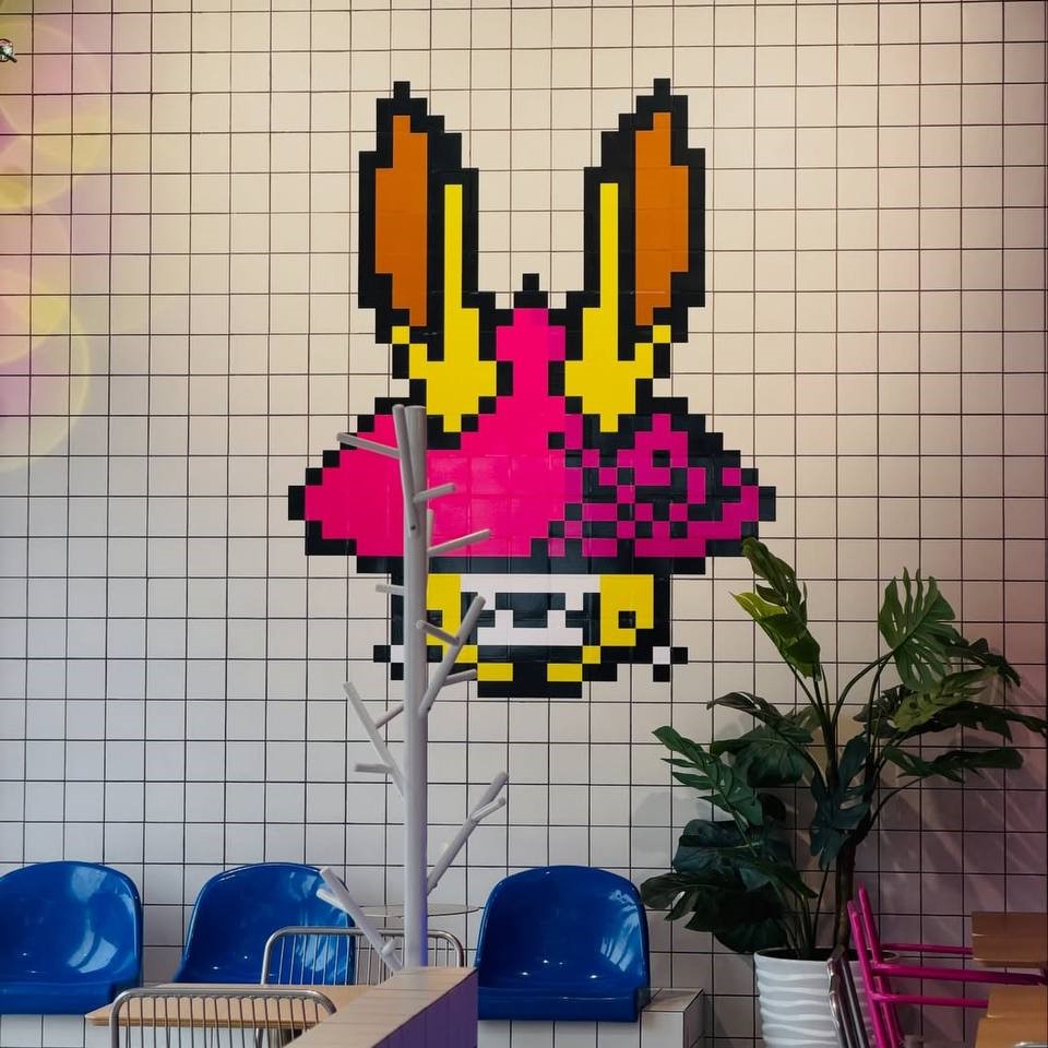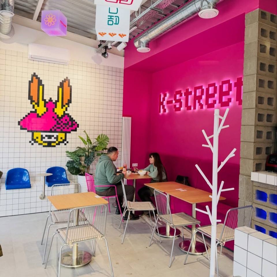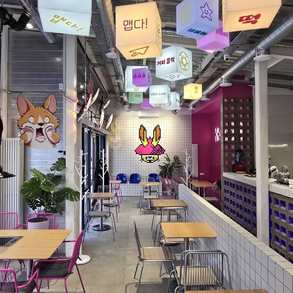 Интерьер пространства выглядит как сочетание креативного арт-кафе и игровой ретро-стилистики. Цветовая палитра строится на сочетании белой плитки, серого бетона и ярких розово-фиолетовых акцентов — типичное решение для корейских молодежных пространств и pop-up кафе.